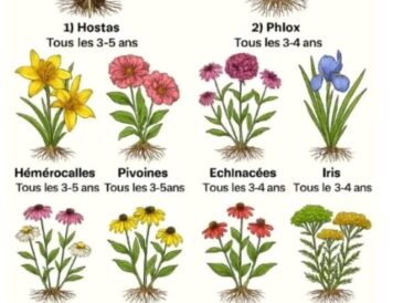 L’affiche présente une liste de vivaces « faciles à diviser » avec, pour chacune, l’intervalle conseillé entre …