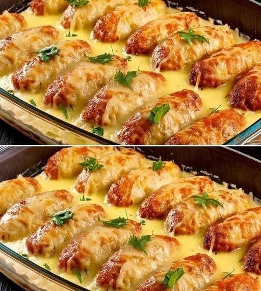 Rouleaux de chou farcis sur un lit de légumes et garnis de fromage : un classique familial savoureux au quotidien !