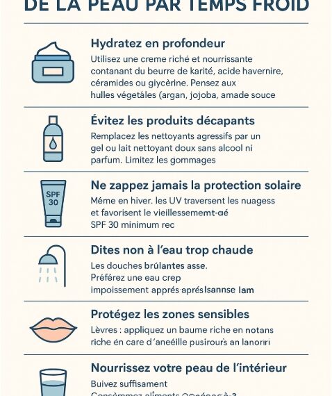 Voici des conseils indispensables pour prendre soin de votre peau par temps froid. L’hiver agresse l’épiderme : air sec, vent, chauffage intérieur… tout cela favorise sécheresse, tiraillements, rougeurs et irritations. Une routine adaptée permet de préserver une peau souple, douce et protégée.