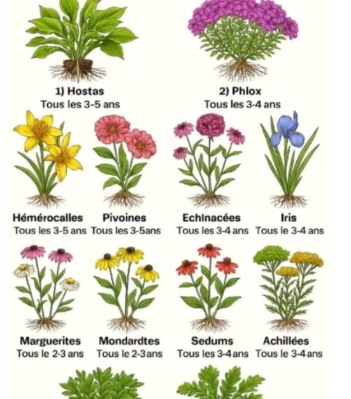 L’affiche présente une liste de vivaces « faciles à diviser » avec, pour chacune, l’intervalle conseillé entre deux divisions. L’objectif est pédagogique : aider le jardinier à rajeunir les touffescontrôler leur étalement et multiplier les plants gratuitement.